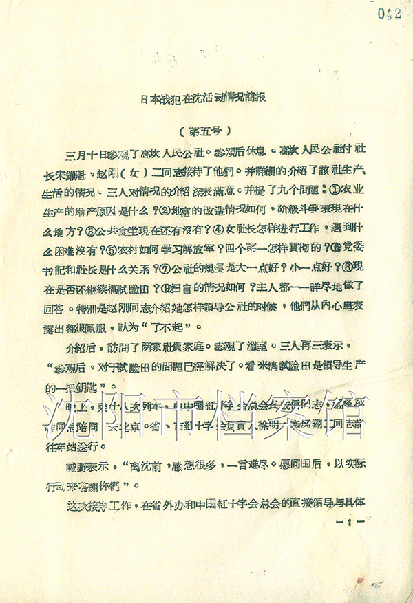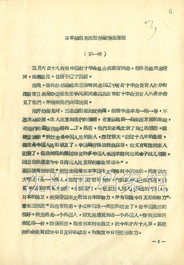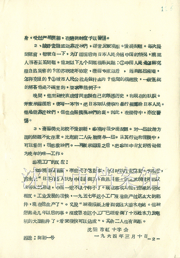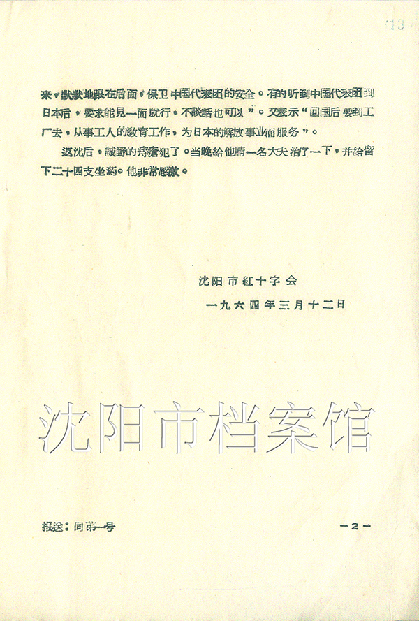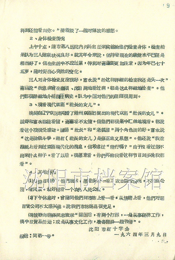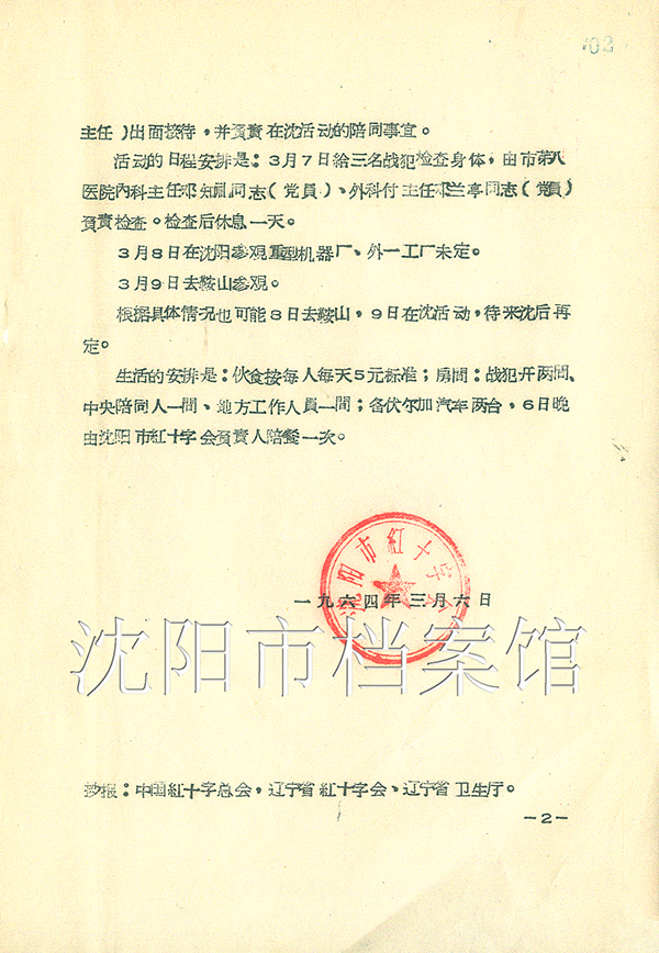 此次公布的档案是最后一批被释放的三名日本战犯于1964年3月6日—11日到沈阳等地参观的档案,共6件。其内容为:沈阳市红十字会《关于安排日本三名战犯释放后来沈参观活动的意见》《日本战犯在沈阳活动情况简报》。