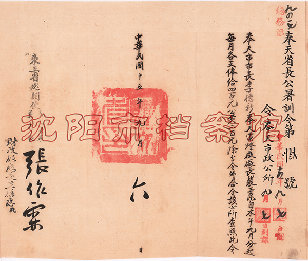 张作霖对李德新继任市长寄予厚望,亲笔签名批准其薪俸标准:奉天市市长李德新自本年九月分起,每月支俸给四百元、公费二百元 (见图三)。这也是沈阳市档案馆馆藏奉天市政公所档案中,唯一一份由张作霖亲笔签署的文件,而其他文件只加盖张作霖印章。
