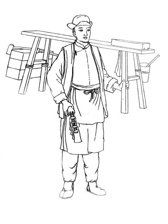 商贩们的“吆喝”有的是用流畅动听的艺术语言,有的是唱小曲或说顺口溜,还有的敲打一些器物,或用简单的乐器击奏些单调而有节奏的声响来代替吆喝,这种招徕市声也称“代声”。