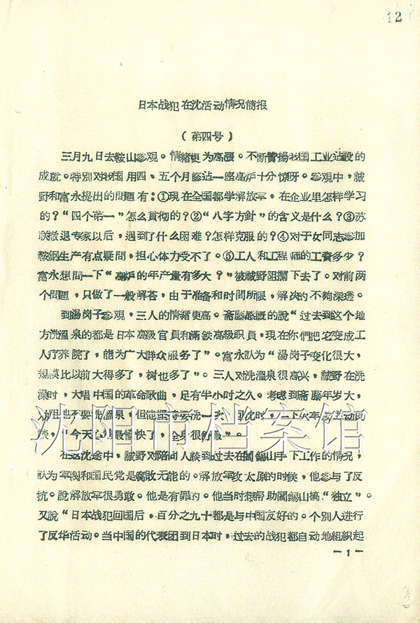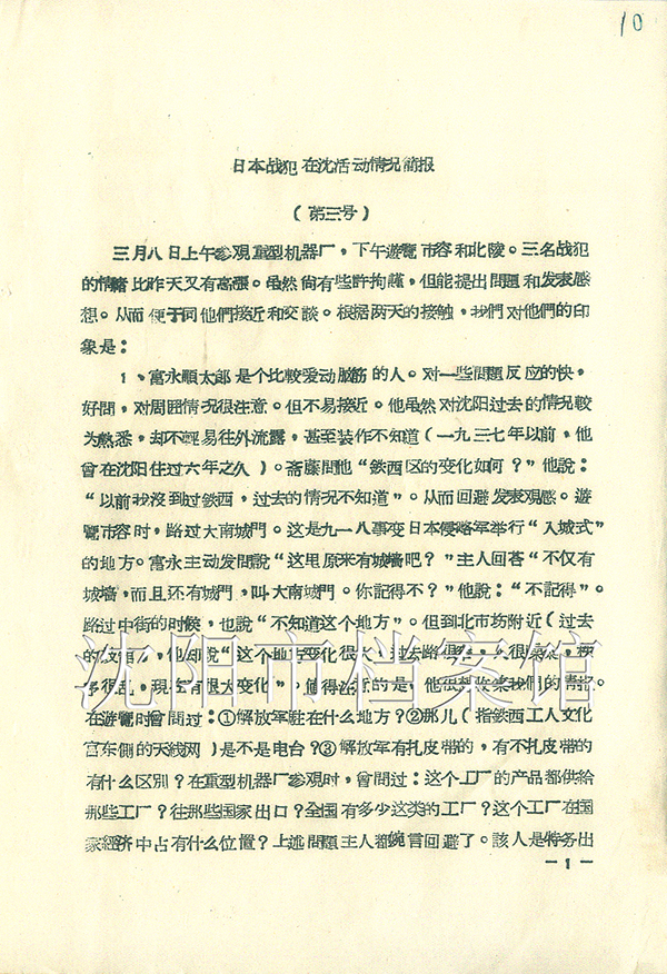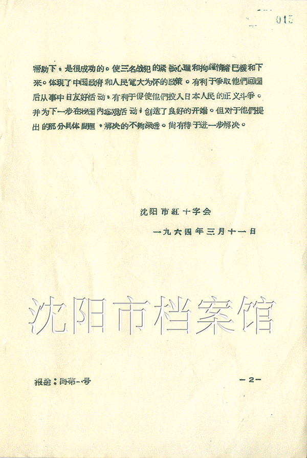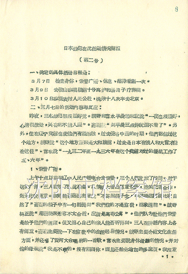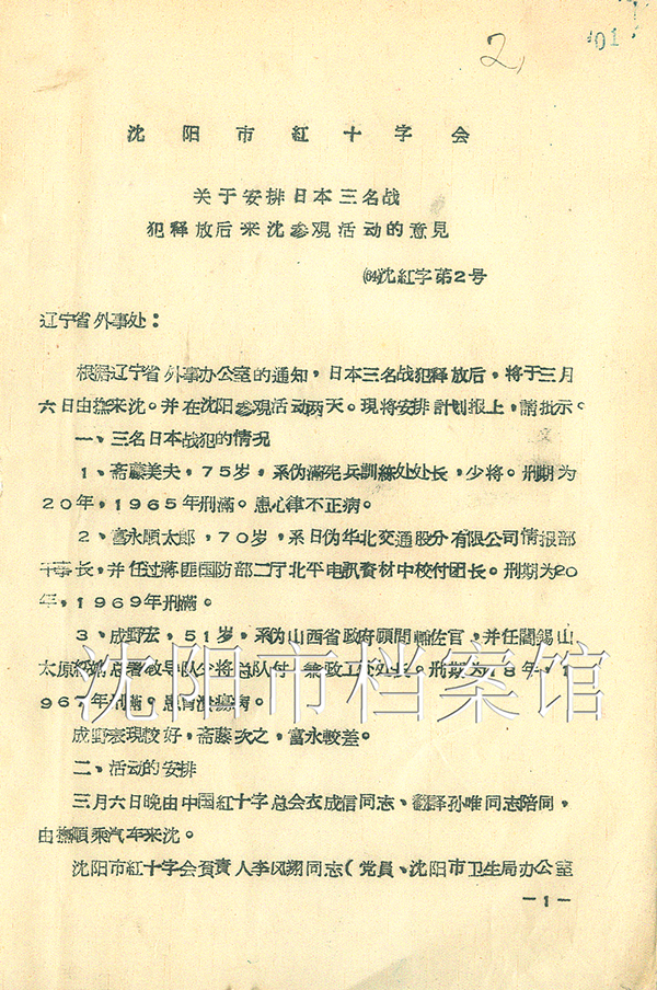 此次公布的档案是最后一批被释放的三名日本战犯于1964年3月6日—11日到沈阳等地参观的档案,共6件。其内容为:沈阳市红十字会《关于安排日本三名战犯释放后来沈参观活动的意见》《日本战犯在沈阳活动情况简报》。