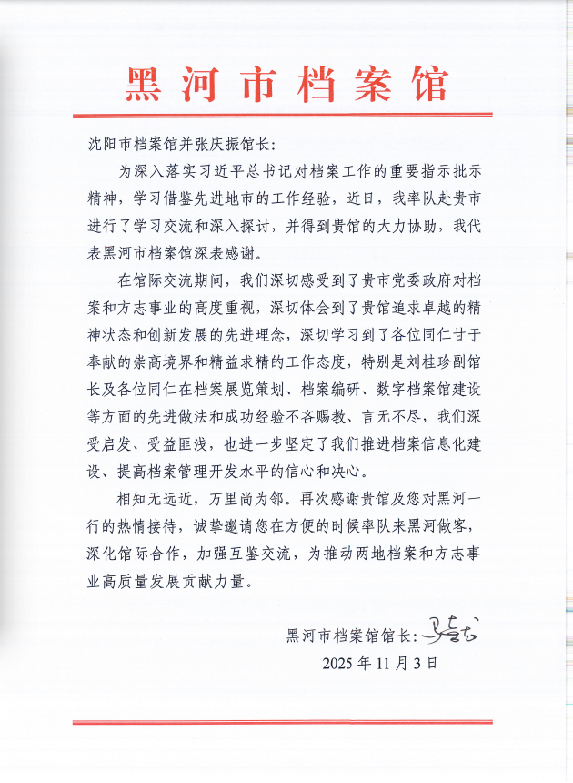在调研过程中,双方就档案工作的创新发展、信息化转型及资源开发利用等内容进行了深入交流。马喜龙馆长对我馆的热情接待和细致安排表示感谢,并对我馆在档案展览策划、编研开发、数字档案馆建设等方面取得的成果给予高度评价。
