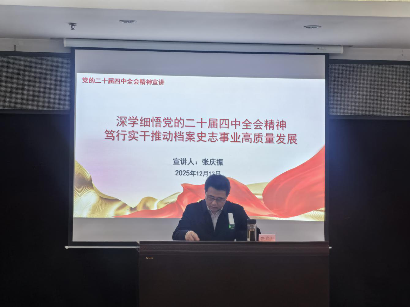 为深入学习宣传贯彻党的二十届四中全会精神,深刻领会“十五五”时期社会发展的战略蓝图与重大举措,切实把全馆干部职工的思想和行动统一到全会决策部署上来,12月12日,市档案馆(市文史研究馆)馆长张庆振面向全馆干部职工作学习贯彻党的二十届四中全会精神宣讲。